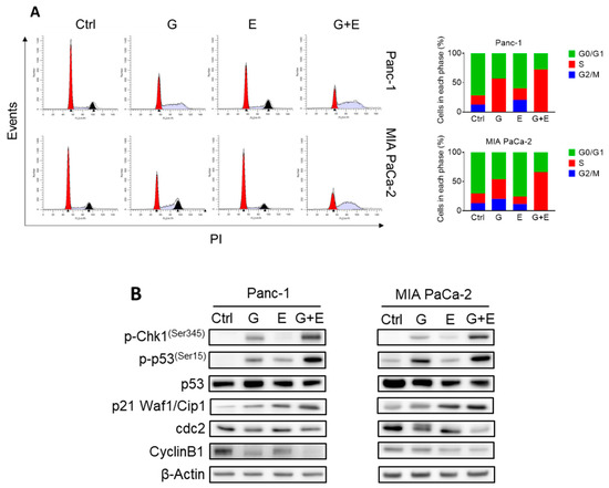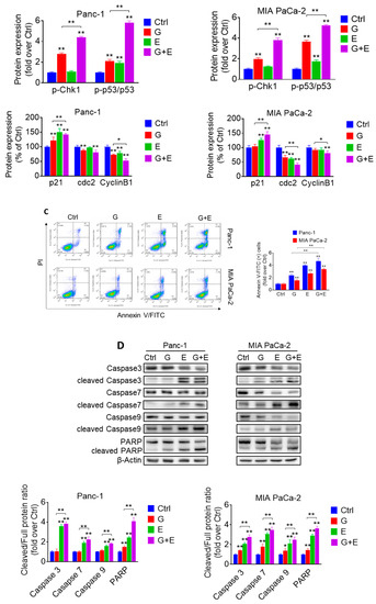 In vitro, we determined the effect of EGCG and gemcitabine on cell cycle progression and cell death by apoptosis. As expected, gemcitabine, an inhibitor of DNA synthesis [19], strongly induced Synthesis/Gap2 (S/G2) phase arrest after 48 h of treatment. While EGCG at 40 µM only slightly arrested cell cycle progression, it strongly enhanced the effect of gemcitabine, with the combination further blocking the cell cycle at S/G2 in Panc-1 and MIA PaCa-2 cells (Figure 6A). Concomitant with cell cycle arrest, expression levels of S/G2 checkpoint proteins, including phosphorylated checkpoint kinases 1 (p-Chk1), phosphorylated tumor protein p53 (p-p53), and cyclin-dependent kinase (cdk) inhibitor p21 Waf1/Cip1 (p21) further increased, while cdc2 and CyclinB1 were further reduced in the EGCG plus gemcitabine-treated cells compared to those treated with gemcitabine alone (Figure 6B, Figure S8).