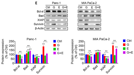 EGCG and gemcitabine together further affected cell kinetic in pancreatic cancer cells. (A) EGCG (E) enhanced the effect of gemcitabine (G) on the cell cycle. Following treatment with 40 µM EGCG (E), 20 nM gemcitabine (G), or both (G + E) for 48 h, cells were stained with propidium iodide (PI) and the number of cells in each phase of the cell cycle was measured by flow cytometry. Results are expressed as a percentage of control. (B) EGCG (E) and gemcitabine (G) modulated S/G2 phase protein expression. Immunoblots for phosphorylated checkpoint kinases 1 (p-Chk1), phosphorylated and total tumor protein p53 (p53), cyclin-dependent kinase (cdk) inhibitor p21 Waf1/Cip1 (p21), cell division cycle 2 (cdc2) and Cyclin B1 in total cell protein extracts from Panc-1 and MIA PaCa-2 cells treated with EGCG (E), gemcitabine (G), or both (G + E), for 48 h. Loading control: β-Actin. Bands were quantified and results are expressed as a percentage of control. * p < 0.05, ** p < 0.01 vs. control. (C) Panc-1 and MIA PaCa-2 cells were treated with EGCG (E), gemcitabine (G), or both (G + E) for 48 h, and the percentage of apoptotic cells were determined by flow cytometry using dual staining (Annexin V and propipium iodide). The percentages of Annexin V (+) cells was calculated, and results are expressed as the fold-increase over control. Co-treatment with EGCG (E) further increased the apoptosis rate induced by gemcitabine (G) alone after 48 h. Results are expressed as percentage of control. * p < 0.05, ** p < 0.01 vs. control. (D) Immunoblots for full length and cleaved Caspases 3, 7 and 9 as well as full length and cleaved poly (ADP-ribose) polymerase (PARP) in total cell protein extracts from Panc-1 and MIA PaCa-2 cells treated with EGCG (E), gemcitabine (G), or both (G + E) for 48 h. Loading control: β-Actin. Bands were quantified and results are shown as the ratio between the cleaved/full length protein; * p < 0.05, ** p < 0.01 vs. control. (E) EGCG sensitized gemcitabine on apoptosis induction by regulating B-cell lymphoma 2 (Bcl-2) family and Inhibitors of apoptosis proteins (IAP) family protein expression in Panc-1 and MIA PaCa-2 cells after 48 h. Results are expressed as percentage of control. * p < 0.05, ** p < 0.01 vs. control.