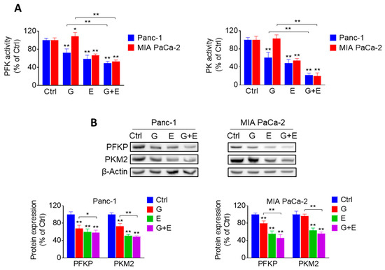 EGCG plus gemcitabine inhibit glycolysis. (A) The activity of PFK and PK was determined in Panc-1 and MIA PaCa-2 cells treated with 40 µM EGCG (E), 20 nM gemcitabine (G), or both (G + E) for 24 h. Results are expressed as a percentage of control. * p < 0.05, ** p < 0.01 vs. control. (B) Immunoblots for PFKP and PKM2 in total cell protein extracts from Panc-1 and MIA PaCa-2 cells treated with EGCG (E), gemcitabine (G), or both (G + E) for 12 h. Loading control: β-Actin. Bands were quantified and results are expressed as a percentage of control. * p < 0.05, ** p < 0.01 vs. control.
