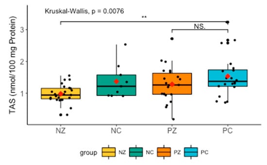 TAS levels differed significantly between the groups. TAS tended to be lower in NZ, but higher in patients without the BRCA1 mutation compared to NZ (H = 11.9263, p = 0.0076) (Figure 1).