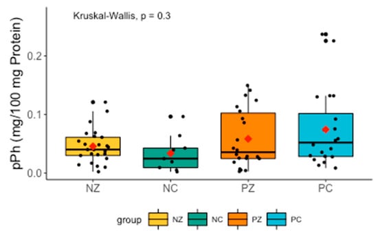 The Kruskal–Wallis test revealed significant differences between the compared groups (H = 9.7921, p = 0.02). The post-hoc Dunn’s test indicated significant differences in 8-isop levels between NZ and PC (H = 2.88315, p = 0.0118), and PC and PZ (H = 2.575711, p = 0.0150) (Figure 10).