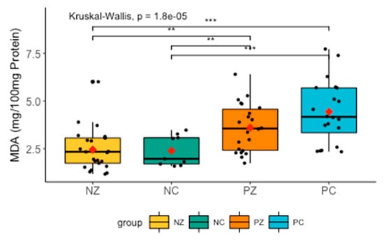 There were significant differences in the levels of MDA between all groups. The post-hoc Dunn’s test revealed significantly higher levels of MDA between groups NC and PC (H = −3.365716, p = 0.001), NC and PZ (H = −2.285397, p = 0.0167), NZ and PC (H = −4.410597, p = 0.0000), as well as NZ and PZ (H = 2.998435, p = 0.0027) (Figure 9).