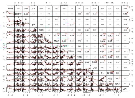 The strongest positive correlations were found between TAS and AGE (r = 0.92, p < 0.0005), and TOS and OSI (r = 0.91, p < 0.0008). The strongest negative correlations were found between TP and TAS (r = −0.87, p < 0.0021), and between TP and AGE (r = −0.86, p < 0.0026) (Figure 13).
