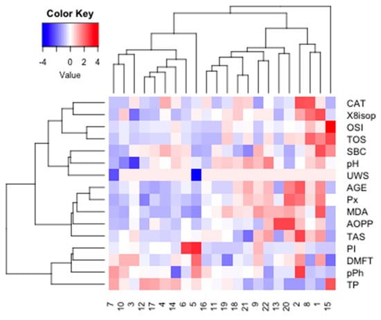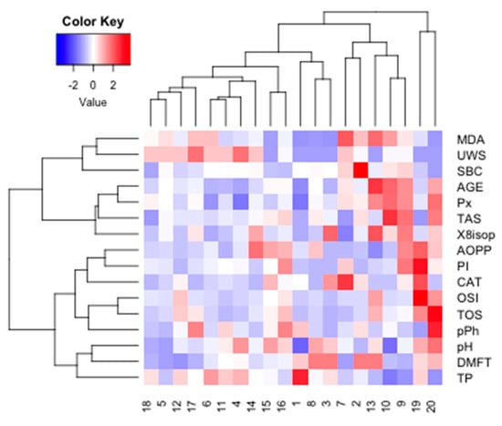 Heat map for all examined subjects. AOPP, advanced oxidation protein products; TP, total protein; OSI, oxidative stress index; TOS, total oxidant status; TAS, total antioxidant status; CAT, catalase activity; pPh, total phenolic content; Pl.I score, Plaque Index; DMFT, decay, missing, filled teeth; UWS, unstimulated whole saliva; SBC, salivary buffer capacity; 8-isop, concentration of 8-isoprostane; MDA, concentration of malondialdehyde; AGE, advanced glycation end-products; SBC, buffer capacity of saliva; Px, activity of salivary peroxidase.