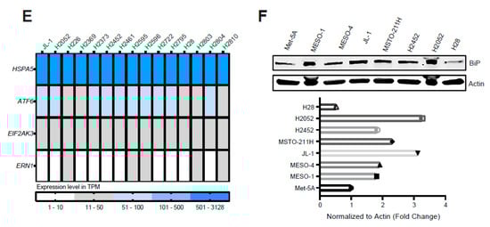 Transcriptomic dataset of normal and MPM tumor samples (GSE2549 and GSE51024) were downloaded from the Gene Expression Omnibus (GEO) database [31,32] and subjected to gene set enrichment analysis (GSEA). Transcriptomic data of cancer patients were obtained from the Cancer Genome Atlas (TCGA) (https://portal.gdc.cancer.gov/projects/TCGA). The expression of key UPR genes in MPM cell lines were downloaded from the European Bioinformatics Institute of European Molecular Biology Laboratory (EMBL-EBI, http://www.ebi.ac.uk/). The UPR status of tumors was determined by the UPR gene signature, scored as the sum of the reactome unfolded protein response gene set.