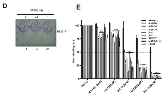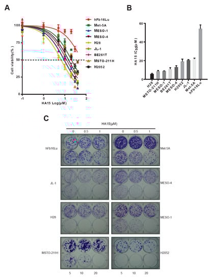 To address if ER stress/UPR signaling can be a potential therapeutic target in MPM, we treated a panel of cells including MPM cell lines across all histological subtypes (MESO-1, MESO-4, H28, JL-1, MSTO-211H, and H2052), a primary MPM culture (BE261T) and non-transformed normal cells (hFb16lu, Met-5A), with HA15, an agent inducing excess ER stress by specifically targeting BiP [29]. HA15 preferentially suppressed cell viability of MPM cells, with the 50% inhibitory concentration (IC50) ranging from 5.71 to 20.51 µM, whereas it only mildly affected Met-5A and hFb16lu cells (Figure 2A,B). Clonogenic assay confirmed that HA15 is far more deleterious for MPM cells than fibroblast hFb16lu and mesothelial Met-5A cells (Figure 2C–E). These results suggest that targeting BiP by HA15 preferentially inhibits MPM cells and is therefore a potential therapeutic strategy for MPM.