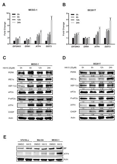 HA15-induced ER stress activates malfunctional UPR in MPM cells. (A,B) qRT-PCR of MESO-1 and BE261T cells after treatment with HA15 (10 uM) for the indicated time points. Data are presented as mean ± s.d. (n = 3). * p < 0.05, ** p < 0.01, and **** p < 0.0001 by two-way ANOVA with Dunnett’s multiple comparisons test. (C,D) Western blots of MESO-1 and BE261T cells after treatment with HA15 (20 uM) for the indicated time points. Quantification of the protein levels is shown under each band, with signal intensity measured by ImageJ and normalized to the loading control (β-actin). The value of the proteins in the vehicle group was set as 1. (E) Western blots of normal human lung fibroblasts (hFb16Lu), normal human mesothelial (Met-5A), and MPM cells (MESO-1) after treatment with HA15 (20 uM) for 24 h. Protein quantification is shown underneath, whereby signal intensity was assessed by ImageJ and normalized to the loading control (β-actin), with the value of the DMSO group set as 1.