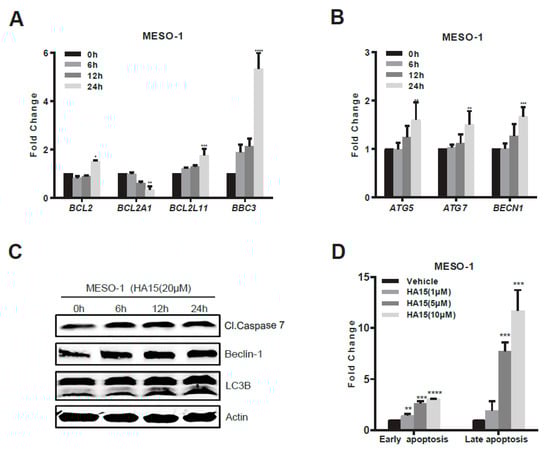 Next, we addressed the molecular underpinnings of HA15 effects in MPM. HA15 induced persistent ER stress in MPM cells, measured by increased expression of key UPR genes [EIF2AK3 (PERK), ERN1 (IRE1α), ATF4 (ATF4), XBP-1s, DDIT3 (CHOP)] at both mRNA and protein levels (Figure 3A–D). Notably, this HA15-induced increase of UPR gene expression (ATF4) did not occur in hFb16lu and Met-5A cells (Figure 3E). Moreover, HA15 treatment markedly augmented autophagic genes [ATG5 (Autophagy protein 5), ATG7 (Autophagy protein 7), BECN1 (Beclin-1), and LC3B-II] (Figure 4A–C) and induced massive cell death in MESO-1 cells, marked by the time- and dose-dependent increase of pro-apoptotic markers [BCL2L11 (BIM), BBC3 (PUMA), and cleaved caspase 7 (Cl.Caspase 7)] (Figure 4A–C). Flow cytometry-based measurement of apoptotic cell populations confirmed that the HA15 treatment resulted in MPM cell death in a dose-dependent manner (Figure 4D,E).