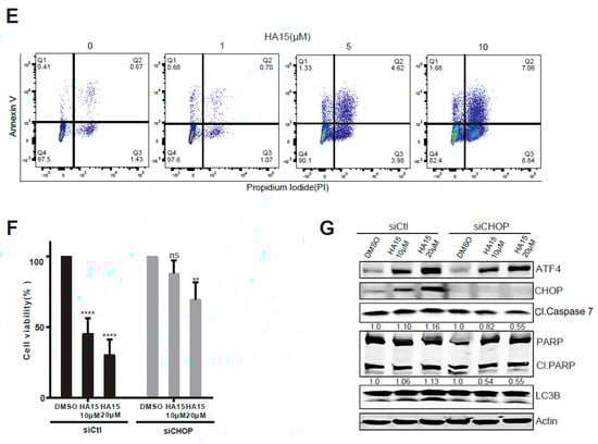 To test if the ER stress/UPR signaling axis is functionally important for HA15 effects on MPM cells, we knocked down DDIT3 (encoding CHOP), a key effector of malfunctional UPR that leads to apoptosis. While HA15 dose-dependently decreased cell viability and concomitantly increased CHOP, apoptosis (cleaved caspase 7/PARP), and autophagy (LC3B-II/LC3B-I ratio) in MESO-1 cells with intact CHOP (siControl), CHOP depletion significantly attenuated HA15-induced growth inhibition, apoptotic, and autophagic indices in MESO-1 cells (Figure 4F,G). As expected, ATF4, which acts upstream of CHOP, was largely unaffected by CHOP downregulation and remained active in response to HA15 (Figure 4G). These data delineate that HA15 selectively triggers MPM cell death by inducing excessive ER stress and the onset of malfunctional UPR and autophagy.