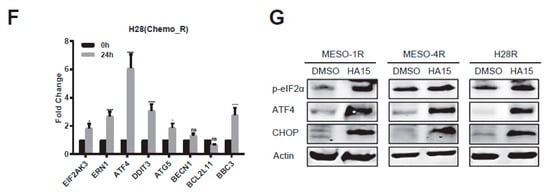 To test if the effectiveness of HA15 can be extended to MPM cells resistant to standard chemotherapy, we generated chemo-resistant MPM cells by chronic exposure to stepwise-increasing doses of cisplatin/pemetrexed (Figure 5A). Both chemo-resistant (_R) and parental (_S) MPM cells responded to HA15 in a dose-dependent manner (Figure 5B,C). Coherent with the results from parental chemo-naïve MPM cells (Figure 3), HA15 induced excess ER stress, malfunctional UPR, and apoptotic cell death in chemo-resistant MPM cells, gauged by significant upregulation of UPR genes (EIF2AK3, ERN1, ATF4, DDIT3), autophagy (ATG5, BECN1), and pro-apoptosis [BCL2L11 (BIM), BBC3 (PUMA)] (Figure 5D–F). Western blot analysis confirmed that HA15 invoked ER stress-activated malfunctional UPR (increased p-eIF2α and CHOP) in chemo-resistant MPM cells (Figure 5G), which is known to lead to apoptosis.