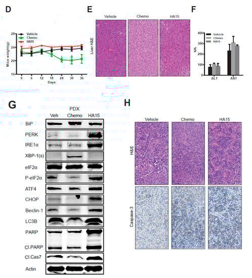 Finally, we tested in vivo efficacy of HA15 through a comparison with standard chemotherapy (cisplatin/pemetrexed (MTA) in a patient (BE261T)-derived xenograft (PDX) model of MPM. Whereas HA15 and cisplatin/MTA alone delayed PDX tumor growth compared to the vehicle treatment, HA15 at the administrated dose exhibited greater anti-tumor effect than chemo (Figure 6A–C). Notably, the efficacy of chemo was achieved at the cost of high toxicity, but HA15 at the used dose showed no obvious side effects, monitored by body weights (Figure 6D) and a toxicity analysis that assessed liver histology and hepatic transaminase (AST/ALT) activities in the treated mice (Figure 6E,F). Importantly and in line with our in vitro results, PDX tumors after HA15 treatment displayed persistent activation of ER stress-induced UPR (PERK, IRE1α, p-eIF2α, ATF4) and autophagy (Beclin-1, LC3B-II), which was deemed anti-survival (CHOP), and enhanced cell death (Cl PARP, Cl Cas 7, Cl Cas 3) (Figure 6G,H). Thus, pharmacological perturbation of ER stress/UPR signaling by HA15 shows strong anti-MPM efficacy by inducing tumor cell death, validating HA15 as a potential therapeutic for MPM.