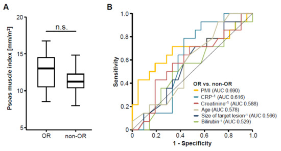The pre-interventional PMI does not correlate with treatment response to transarterial chemoembolization (TACE) therapy. (A) Patients who showed an objective response (OR) to TACE therapy have a similar PMI compared to non-responding (non-OR) patients. (B) Receiver operating characteristic (ROC) curve analysis regarding the discrimination between OR and non-OR patients.