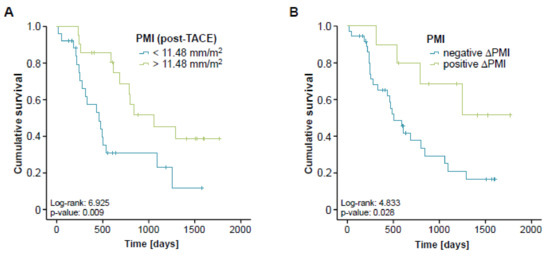 Post-interventional sarcopenia is associated with a poor prognosis after TACE. (A) Patients with a post-interventional PMI below the ideal cut-off value (11.48 mm/m2) have a significantly impaired long-term survival following TACE therapy. (B) Patients with progressive sarcopenia after TACE (negative ∆PMI) show a significantly reduced overall survival compared to patients with a reduced level of sarcopenia after therapy (positive ∆PMI).