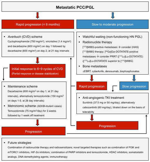 - Niemeijer, N.D.; Alblas, G.; van Hulsteijn, L.T.; Dekkers, O.M.; Corssmit, E.P. Chemotherapy with cyclophosphamide, vincristine and dacarbazine for malignant paraganglioma and pheochromocytoma: Systematic review and meta-analysis. Clin. Endocrinol. 2014, 81, 642–651. [Google Scholar] [CrossRef] [PubMed]