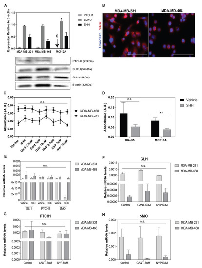 - Mukherjee, S.; Frolova, N.; Sadlonova, A.; Novak, Z.; Steg, A.; Page, G.; Welch, D.R.; Lobo-Ruppert, S.M.; Michael Ruppert, J.; Johnson, M.R.; et al. Hedgehog signaling and response to cyclopamine differs in epithelial and stromal cells in benign breast and breast cancer. Cancer Biol. Ther. 2006, 5, 674–683. [Google Scholar] [CrossRef] [PubMed]