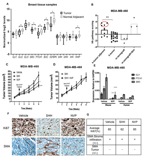 Hedgehog (Hh) signaling in breast tumor tissues and a mouse xenograft model of triple negative breast cancer (TNBC). (A) Hh pathway scores for a total of 20 tumors and 10 paired “normal-adjacent tissue” from fresh tumor samples from breast cancer patients in Puerto Rico (PR) were evaluated using the PanCancer pathways array from Nanostring. MDA-MB-468 xenograft tumors +/− Sonic hedgehog (SHH)-ligand collected at two weeks post-injection were used as negative and positive controls for SHH-signaling. TNBC samples are highlighted in red. Adjusted ** p-value < 0.005. (B) The normalized log2 expression for Hedgehog-pathway genes across tumor and normal adjacent breast tissue samples are shown in (A). Significance determined by Student t-test * p-value < 0.05. (C,D) Tumor growth curves in xenograft tumors composed by MDA-MB-468 +/− SHH-ligand. NVP or Vehicle was administered daily during the last four weeks. Data shows mean +/− standard error of mean (SEM) of nine mice per group. Significance was determined via ANOVA analysis. * p-value < 0.05, **** p-value < 0.0001. (E) Expression levels of glioma associated oncogene family zinc finger 1 (GLI1) and patched1 (PTCH1) transcripts relative to Glyceraldehyde-3-Phosphate Dehydrogenase (GAPDH) in xenografts tumors and NIH3T3 cells using human and mouse-specific primers. Data shows mean +/− SEM of six mice per condition. Significance was determined via ANOVA analysis, Adjusted *** p-value < 0.001 and **** p-value < 0.0001. (F) Representative immunohistochemistry staining from mouse tumor xenografts treated with Vehicle, NVP, and SHH-ligand. Scale bar = 20 µm. (G) Average values of Ki67 and SMA staining for two tumors of each experimental treatment were summarized based on the reported values in the pathology report.