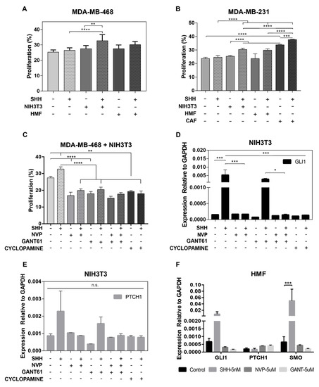 The following are available online at https://www.mdpi.com/2072-6694/11/10/1522/s1, Figure S1: Full western blots of breast cancer cells, Figure S2: Full western blot of fibroblast cell lines and MCF10A Figure S3: Effect of SHH-ligand and Hh inhibitors in Luminal A and non-tumorigenic breast cancer cells, Figure S4: Characterization of mesenchymal markers and Hh signaling in fibroblasts, Figure S5: Primary cilium in fibroblasts, Figure S6: Proliferation of ER+ tumor cells in co-culture with HMF, Figure S7: Hh signaling in NIH3T3 across culture modalities, Figure S8: Proliferation of NIH3T3 and Hs578t cells in tumor co-cultures, Figure S9: Characterization of Hh components in ADMSC.