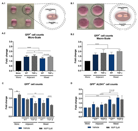Paracrine signaling plays an essential role in TNBC, where studies have prioritized this behavior primarily mediated by tumor-adjacent CAFs [24]. This paracrine interaction can be modeled via both adjacent and mixed tumor-CAF cultures, yet no studies have been done to determine the impact of culture modalities and fibroblast subtype in the observed tumor behavior. Here we explore the impact of both culture modalities, and fibroblast vs. CAF-like cells on the growth and expression of CSC markers in MDA-MB-231 cells. We used GFP-tagged (GFP) MDA-MB-231 for fast-tracking and identification of tumor cells, particularly in mixed cultures. NIH3T3 wild-type (WT) and NIH3T3 pre-treated with TGF-β were evaluated as models of fibroblasts and CAF-like cells. ALDH1, a well-established marker of breast cancer stem cells (CSCs) [24], was used to monitor changes in the CSCs proportion. The two-adjacent microwell culture device [25] (Figure 4A.1) was scaled-up by a factor of nine (Figure 4B.1) to obtain sufficient tumor cells for quantification of ALDH1 expression using image-based cytometry. Prior to tumor growth studies, Hh signaling activity was examined across culture modalities and compared to monocultures supplemented with SHH-ligand to determine whether GFP-tagged MDA-MB-231 secreted enough SHH-ligand to induce a robust Hh signaling activity in NIH3T3. Results indicate that Gli1, Ptch1, and Smo murine transcripts reached the highest levels in NIH3T3 monocultures treated with SHH-ligand, followed by a medium response in mixed co-cultures (Figure S7). Hh transcripts were low in adjacent co-cultures, suggesting that the diffusivity and local concentration of tumor-secreted SHH-ligand are limited, and indicating that supplementation with exogenous SHH-ligand is needed for robust Hh signaling in the tumor-adjacent NIH3T3 compartment. Tumor and fibroblasts cells were co-cultured for 96 h, and the NVP compound was used to suppress Hh signaling. Tumor growth was evaluated based on total cell counts in both microscale and macroscale devices to rule-out any platform-related artifact. Results show that tumor cell growth was significantly enhanced in both adjacent and mixed cultures as compared to the tumor monoculture condition (Figure 4A.2,B.2). This paracrine growth effect was similar across both macroscale and microscale culture platforms, indicating that the observed results are associated with tumor–fibroblast interactions and not culture platform artifacts. Although a slight increase of marginal significance in the total number of tumor GFP+ cells was detected for co-cultures with TGF-β treated NIH3T3 in the microscale platform (Figure 4A.2), the overall effect on tumor growth was of similar magnitude regardless of the culture modality for both WT and TGF-β co-cultures. Tumor growth was reduced in all co-cultures treated with NVP, but this effect was most potent for TGF-β cultures (Figure 4C). The proportion of GFP+ALDH1+ tumor cells was significantly enhanced in the mixed culture modality only for WT and TGF-β NIH3T3 co-cultures (Figure 4D). The population of ALDH1+ cells was suppressed only in WT co-cultures treated with NVP (Figure 4D), confirming the dependence on Hh pathway activity. This suppressive effect was not observed in co-cultures with TGF-β treated NIH3T3, which suggests that other non-Hh signaling mechanisms are supporting the increase in the ALDH1+ population.