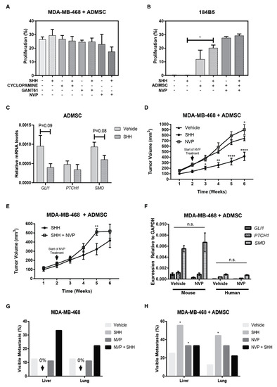 Adipose-derived mesenchymal stem cells (ADMSCs) are an abundant mesenchymal cell subtype in breast tissues [44] that express similar phenotypic markers as fibroblasts, but little is known about their contribution to paracrine Hh signaling. We examined Hh signaling in tumor-ADMSCs co-cultures. Normal ADMSCs derived from the abdominal cavity were selected due to shared similarities with ADMSCs derived from breast tissues [45], documented studies supporting their sensitivity to Hh signaling to block differentiation, and their clonogenic properties [46,47]. Expression of the primary cilium, PTCH1, and fibroblasts markers, FAP, SMA, and VIM, was examined before conducting co-culture studies (Figure S9). ADMSCs stained positive for all phenotypic markers examined, confirming the heterogeneous expression of these pathological markers among mesenchymal cell subtypes. In vitro co-cultures, independent of the addition of SHH-ligand or Hh inhibitors, showed that ADMSCs did not affect proliferation rates of MDA-MB-468 (Figure 6A). However, ADMSCs significantly stimulated the proliferation of the growth-arrested cell monolayer of non-tumorigenic 184B5 cells. This enhanced growth effect was further exacerbated in animals treated with NVP (Figure 6B). GLI1, PTCH1, and SMO transcripts were all detected in ADMSCs. The expression of these transcripts was reduced by the exogenous addition of SHH-ligand, but this effect was of marginal significance (Figure 6C). To determine whether the presence of ADMSC will alter therapeutic response to Hh inhibition in vivo, the proliferative effect of SHH-ligand and sensitivity to SMO antagonist NVP were examined in xenografted tumors composed by MDA-MB-468 + ADMSC. In agreement with in vitro observations, treatment with NVP resulted in significantly-enhanced tumor growth rates in the MDA-MB-468 + ADMSC group (Figure 6D,E). Hh target genes were not suppressed in the mouse stroma (Figure 6E), suggesting that ADMSCs decrease the sensitivity to NVP treatment. Although SHH-ligand appeared to inhibit tumor growth rates (Figure 6D), the number of visible metastases was significantly increased as compared to parallel studies in MDA-MB-468 xenografts (Figure 6G,H). Thus, SHH and NVP were tumor suppressors in the MDA-MB-468 group but tumor promoters in the MDA-MB-468 + ADMSC group. The enhanced growth effect caused by the presence of ADMSCs is probably associated to a remodeling of the tissue, yet it shows that therapeutic benefit of SMO inhibition can be perturbed by the composition of the tumor stroma, further highlighting the relevance of the tumor microenvironment in the therapeutic outcome.