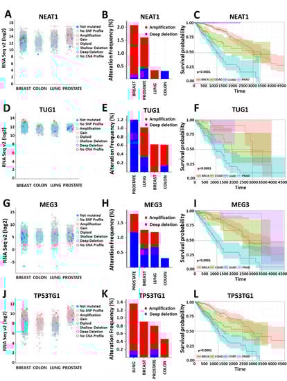 Expression, genetic alteration, and survival analysis of selected lncRNA epigenetic regulators in the most frequent types of cancer based on TCGA (The Cancer Genome Atlas) data. Left panels (A,D,G,J) correlate lncRNA gene expression with copy number variation across cancer types. Middle panels (B,E,H,K) demonstrate amplification and/or deep deletion percentage of each lncRNA gene among patients for each cancer type. Right panels (C,F,I,L) demonstrate average impact on survival time for each cancer type, based on intermediate lncRNA expression (patient stratification cut-offs: >Q1 and <Q3). Dashed lines in Kaplan–Meier plots represent median survival time, p-values correspond to statistical significance of survival difference between all tumor types for each lncRNA. (A–C) Expression, genetic amplification/loss, and survival analysis of NEAT1. Gene copies of this lncRNA are increased in breast and prostate compared with the other cancer types. (D–F) Expression, genetic amplification/loss, and survival analysis of TUG1. This lncRNA has minimum expression variation between cancer types. (G–I) Expression, genetic amplification/loss, and survival analysis of MEG3. This lncRNA has elevated expression in lung cancer patients. (J–L) Expression, genetic amplification/loss, and survival analysis of TP53TG1. This lncRNA is amplified in most cancer types and shows elevated levels of expression in prostate cancer. All data are reanalyzed from UCSC (University of Santa Cruz California) Xena.