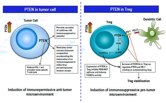 Moreover, a controversial function has been reported in Treg-associated PTEN expression with the growing idea of a new paradoxical pro-tumor-like skill. This evidence suggests a double context-dependent role of PTEN according to the specific cell type. Indeed, PTEN expression is crucial to prevent malignant transformation in normal and precancerous cells, and its loss both drives cancer progression and induces a cascade of events that influence the microenvironment toward an immunosuppressive profile. Contrary to its normal role as a tumor suppressor, PTEN-specific expression in Tregs stabilizes these cells, preventing them from switching to an inflamed T helper-like differentiation, thus contributing to the creation of a Treg-dependent immune-suppressive milieu, which finally allows tumor immune escape and survival. Conversely, Treg decrement causes a deep change of tumor microenvironment, with the acquisition of strong immunogenic features that would be suitable for immunotherapy efficacy. A constitutively high level of PTEN protein has been shown in tumor-associated Treg but not in effector T cells. Specifically, it has been demonstrated that Treg cells require PTEN to sustain their suppressive function, supporting the expression of IL-2Rα, a negative modulator of local immune response, and FOXP3 transcription factor. Indeed, mice bearing Treg-specific deletion of PTEN lose Treg homeostasis and stability, gain Th1 response and B cell activation, and are prone to developing autoimmune disease [43,62]. On these bases, the PTEN pathway in Tregs represents an intriguing clinically actionable target to develop novel antitumor immunotherapeutic strategies.