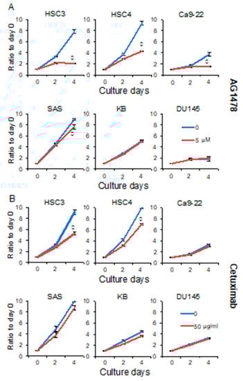 AG1478 and cetuximab have different inhibitory effects on growth of epidermal growth factor receptor (EGFR) inhibitor sensitive (EIS) cancer cells. The HSC3, HSC4, Ca9-22, SAS, KB, and DU145 cells were treated with (A) 5 μM of AG1478 or (B) 50 μg/mL of cetuximab, and MTS assays were performed on days 0, 2, and 4 to assess cell proliferation. A cetuximab of 10 μg/mL is sufficient to suppress cell growth. In this experiment, 50 μg/mL was used to reliability determine cetuximab resistance. Blue lines represent untreated control. Red lines represent AG1478 treatment on panel A and cetuximab treatment on panel B. * Significantly different from control, p < 0.05. Experiments were performed three times independently.