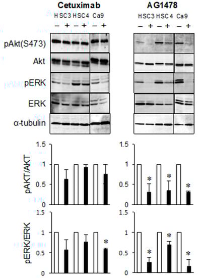 AG1478 and cetuximab have different inhibitory effects on ErbB3 signaling pathway of cancer cells. The HSC3, HSC4, and Ca9-22 cells were treated with cetuximab or AG1478 and the phosphorylation and protein levels of AKT and extracellular signal-related kinase (ERK) were determined by western blotting analysis. α-tubulin was used as the loading control. * Significantly different from control, p < 0.05. Experiments were performed three times independently.