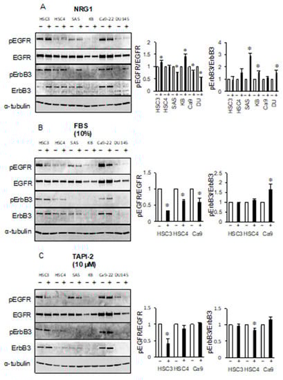 Extracellular signals are not involved in the phosphorylation of ErbB3. Cells were treated with (A) neuregulin 1 (NRG1), (B) 10% fetal bovine serum (FBS), and (C) 10 μM tumor necrosis factor alpha protease inhibitor 2 (TAPI-2) and the phosphorylation levels of EGFR and ErbB3 were determined by western blotting analysis. α-tubulin was used as the loading control. * Significantly different from control, p < 0.05. Experiments were performed three times independently.