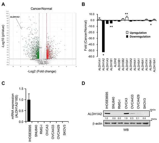 To evaluate whether ALDH isozymes contribute to the progression of ovarian cancer, an Illumina microarray was used to identify differentially expressed ALDH genes in six ovarian cancer cell lines (YDOV-139, YDOV-157, YDOV-161, YDOV-13, YDOV-105, and YDOV-151) and four human ovarian surface epithelial (HOSE) cell lines (HOSE 198, 209, 211, and 213) [24]. RNA isolated from the cells was directly compared by hybridization with cDNA microarrays with 24,957 probe sets. The volcano plot shows that 24,957 genes were differentially expressed (p < 0.01 and fold change > 2) in the cancer cells compared to the normal cells (Figure 1A). We found that 15 ALDH isoforms exhibited differential expression patterns in the ovarian cancer cell lines compared to the normal cells (Figure 1A,B, Table S1). ALDH1A2, ALDH1B1, and ALDH9A1 were downregulated in the ovarian cancer cells compared to the expression in HOSE cells (Figure 1A and Table S1), whereas ALDH3A1 was upregulated in the ovarian cancer cells. Among these isoforms, we further characterized the functional role of ALDH1A2 in ovarian cancer progression, because it was one of the most prominently downregulated genes, with approximately 50-fold lower expression levels in ovarian cancer cells than in normal cells (Figure 1B, Table S1). These decreased expression levels were further validated by real-time PCR, and immunoblotting in ovarian cancer cell lines (SNU840, RMG1, OVCA433, OVCA429, and SKOV3) and IHOSE8695 cells (Figure 1C,D). Taken together, these observations suggest that the expression of ALDH1A2 is strongly downregulated in ovarian cancer.