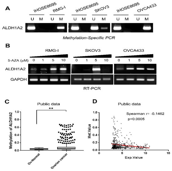 Methylation status of the ALDH1A2 gene in ovarian cancer. (A) Analysis of ALDH1A2 methylation in RMG1, SKOV3, and OVCA433 cells by methylation-specific PCR. U, primer pair specific to unmethylated DNA; M, primer pair specific to methylated DNA. (B) qRT-PCR analysis of ALDH1A2 mRNA levels in 5-Aza-CdR-treated and control cells. GAPDH was used as loading control. (C) Methylation status of ALDH1A2 in the Methylation and Expression database of Normal and Tumor tissues (MENT; http://mgrc.kribb.re.kr:8080/MENT/). A Mann–Whitney test was used to evaluate statistical significances. ** p < 0.05. (D) Correlation between DNA methylation and gene expression of ALDH1A2 were determined by Spearman’s correlation through the MENT database with clinical data with the TCGA ov dataset.