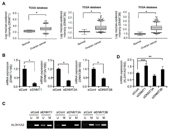 DNA methyltransferase (DNMT) is an upstream regulator of ALDH1A2 expression. (A) Data on the mRNA expression of DNMT1, DNMT3A, and DNMT3B obtained from the Oncomine database (http://www.oncomine.com). A Mann–Whitney test was used to evaluate statistical significances. * p < 0.001. (B) Expression of DNMT1, DNMT3A, and DNMT3B in RMG1 cells, as determined by real-time PCR. Knockdown of DNMT1, DNMT3A, and DNMT3B was performed by transfecting RMG1 cells with specific siRNAs, siDNMT1, siDNMT3A, and siDNMT3B, respectively. Nontargeting siRNA (siCont) was used as a control. The 18S rRNA gene was used as the endogenous control to normalize the data. Data are expressed as the means ± SD. Statistical significance was assessed using an unpaired t-test. * p < 0.001. (C) Analysis of ALDH1A2 methylation by methylation-specific PCR after knockdown of DNMT1, DNMT3A, and DNMT3B in RMG1 cells. Knockdown of DNMT1, DNMT3A, and DNMT3B was performed by transfecting RMG1 cells with specific siRNAs, siDNMT1, siDNMT3A, and siDNMT3B, respectively. The lysates were subjected to methylation-specific PCR. Nontargeting siRNA (siCont) was used as a control. U, primer pair specific to unmethylated DNA; M, primer pair specific to methylated DNA. (D) ALDH1A2 expression after transfection of RMG1 cells with siDNMT1, siDNMT3A, or siDNMT3B, as determined by real-time PCR. Nontargeting siRNA (siCont) was used as a control. The 18S rRNA gene was used as the endogenous control to normalize the real-time PCR data. ** p < 0.05, *** p < 0.005.