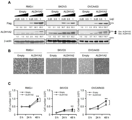 Effects of forced expression of ALDH1A2 on the proliferation of ovarian cancer cells. (A) Cells were transfected with vector expressing Flag-tagged ALDH1A2 or empty vector. After 24 h, whole lysates were immunoblotted with anti-ALDH1A2 and anti-Flag antibodies. β-Actin was used as a loading control. Densitometric analysis was performed by ImageJ software. The protein levels were normalized to the signal of β-actin. (B,C) Effects of forced expression of ALDH1A2 on the proliferation of ovarian cancer cell lines. Cells were transfected with Flag-tagged ALDH1A2 or empty vector. After indicated times, phase contrast images were observed (B). The cells were trypsinized with trypsin–EDTA, and the number of viable cells (C) was determined by a Vi-Cell XR cell viability analyzer at indicated time points. Original magnification: 20×. Statistical significance was assessed using an unpaired t-test. ** p < 0.05.