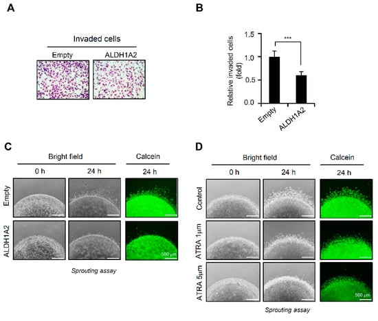To elucidate the function of reduced ALDH1A2 in ovarian cancer progression, we constructed the pCMV-TagB-Flag-ALDH1A2 expression vector to overexpress ALDH1A2 in ovarian cancer cell lines. The overexpression of this construct in RMG1, SKOV3, and OVCA433 cells was confirmed by immunoblot analysis using antibodies against ALDH1A2 or Flag (Figure 4A) and by immunocytochemistry with anti-Flag antibodies (Figure S1). Forced expression of ALDH1A2 decreased cell proliferation in a time-dependent manner and induced S-phase cell cycle arrest (Figure 4B,C, Figure S2A), whereas it failed to affect cell death (Figures S2B and S3). Furthermore, the forced expression of ALDH1A2 significantly impaired the invasive behavior of RMG1 cells (Figure 5A,B). We further confirmed the effect of ALDH1A2 overexpression on the invasive capacity of cells by using Matrigel-embedded sprouting assays, which was evaluated as their ability to spread from 3D-matrigel spheroids (Figure 5C). The ALDH1A2 construct-transfected cells showed significantly lower spreading capacity than the empty vector-transfected cells. Next, as ALDH1A2 is the first enzyme to produce RA, we investigated the effect of ATRA, an active vitamin A metabolite, on inducing the constitutive activation of retinoid signaling. Treatment of ovarian cancer cell lines with ATRA significantly impaired their invasive capacity and spread from 3D Matrigel spheroids (Figure 5D). Collectively, these observations suggested that ALDH1A2 plays a critical role in mediating the invasion activity of ovarian cancer cells.