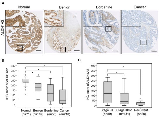 Reduced ALDH1A2 expression correlates with poor prognosis in ovarian cancer patients. (A) Representative images of immunohistochemical staining of ALDH1A2 expression in epithelial ovarian tissues from benign, borderline, and carcinoma patients and in nonadjacent normal tissues (Scale bar: 250 μm). (B,C) Box plot depicting the immunohistochemical staining data. Histoscores were computed based on the intensity and tissue area of positive staining. * p < 0.001.