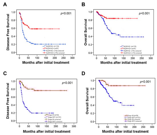 Kaplan–Meier survival curve for patients with epithelial ovarian cancer. (A,B) Patients with ALDH1A2− tumors (histoscore < 70) showed significantly worse disease-free (A) and overall survival (B) than patients with ALDH1A2+ tumors. (C,D) Patients with advanced stages (III/IV) showed significantly worse disease-free (C) and overall survival (D) than patients with early-stage ovarian cancer.