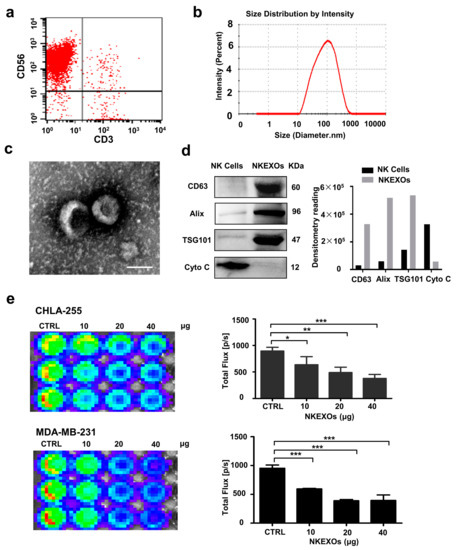 Characterization and function of isolated NKEXOs. (a) Flow cytometric analysis of NK cells (CD3− and CD56+) grown for a total of 21 days. (b) Size distributions of NKEXO measured by dynamic light scattering show peak diameters at 100 nm. (c) The morphology of exosomes was analyzed by transmission electron microscopy. (d) Western blot analysis of CD63, ALIX, TSG101 and cytochrome c (Cyto C) expression level in NK cells and NKEXOs. (e) MDA-MB-231luc and CHLA-255luc cell lines (104 cells per well) were incubated with control medium and different amounts of NKEXOs (10, 20 and 40 µg) for 24 h. Cell viability was assessed by bioluminescence imaging. Each bar represents the mean ± SD of three replicates. * p < 0.05; ** p < 0.01 and *** p < 0.001.