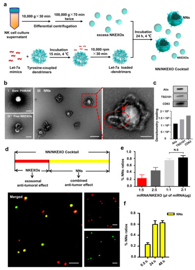 Fabrication and characterization of the NN/NKEXO cocktail. (a) Schematic design of the NN/NKEXO cocktail. (b) TEM images of bare PAMAM dendrimers (i), NNs (ii) and free NKEXO in supernatant (iii). The arrow indicates an integrated NKEXO. (c) NNs contain typical intracellular proteins markers (ALIX, TSG101), confirmed by Western blot (WB). (d) CLSM images of the fabricated NN/NKEXO cocktail illustrating the colocalization of let-7a loaded dendrimers (green) and NKEXO (red). (e) Percentages of NNs in the NN/NKEXO cocktail at different miRNA to NKEXO ratios. (f) Percentages of NNs in NNs-NKEXO cocktail at different synthesis times at a 1:1 miRNA to NKEXO ratio.