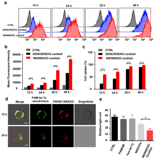 Next, we evaluated the nanoparticle cocktail kinetics in human neuroblastoma CHLA-255 cells at different incubation times with the dual labeled cocktail (miRNA loaded dendrimers: FAM, green and NKEXOs: PKH-26, red), followed by observation via CLSM. As shown in Figure 3a, the internalization of both NKEXOs and let-7a inside tumor cells increased from 12 to 24 h. Additional quantitative measurements were performed using flow cytometry. Equivalent exosomes derived from human embryonic kidney cell line 293T were obtained and 293N/293EXO cocktail was synthesized as control. The fluorescence intensity of let-7a mimics in CHLA-255 cells increased along with the NKEXO fluorescence in a time-dependent manner. Neither fluorescence intensities weakened until cells were incubated for at least 48 h. Importantly, CHLA-255 cells treated with the NN/NKEXO cocktail showed a prominent right shift in the cytometric analysis, suggesting a higher cellular uptake of exosomes than 293N/293EXO cocktail (Figure 3b). Furthermore, more CHLA-255 cells internalized miRNA, with the mean fluorescence intensity value higher than in the control cocktail at any time point (Figure 3c,d). This indicates that the NKEXO based outer shell plays a critical role in improving the cancer target drug delivery efficiency. We also used the bioluminescence assay to substantiate the synergistic apoptosis-inducing capability of the cocktail in vitro. Since let-7a, a therapeutic microRNAs, is closely involved in the proliferation of neuroblastomas [34,35]. As shown in Figure 3e, after 24 h of incubation, NN/NKEXO cocktail-let-7a exhibited significantly higher cytotoxicity compared with NKEXO alone in neuroblastoma cells. In contrast, no significant inhibition of cell growth was observed in let-7a or dendrimers treated groups, indicating that the NNs mediated delivery of therapeutic let-7a enhances the anti-tumor effect of the cocktail by triggering a synergistic induction of apoptosis.