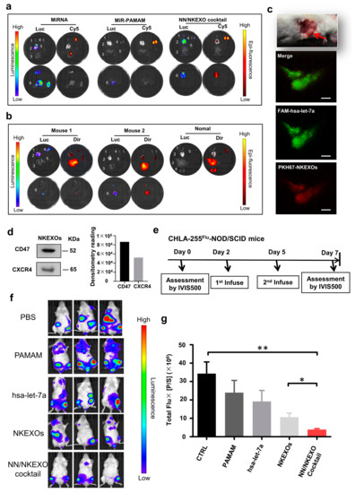 To evaluate the tumor targeting capability of the cocktail, let-7a was labeled with Cy5 and the cocktail was administrated intravenously into the CHLA-255-luc tumor-bearing nonobese diabetic/severe combined immunodeficient (NOD/SCID) mice. After removal of the tumors and organs of interest 6 h after injection, ex vivo fluorescence imaging showed strong fluorescence signals of let-7a loaded dendrimers in the tumor tissues and relatively strong signals in the kidneys. In contrast, no specific fluorescence was detected in tumor tissues of mice treated with miRNA alone or miRNA loaded dendrimers (Figure 4a). These results indicate that the NN/NKEXO cocktail have highly efficient targeting and miRNA delivery to tumor cells. NKEXOs showed tumor-specific accumulation as early as 24 h post-injection in vivo [6]. Here, we labeled NKEXOs with DiR (red) to prepare the cocktail administrated intravenously. Interestingly, using ex vivo fluorescence imaging (Figure 4b), NKEXOs showed tumor-specific accumulation as early as 6 h post-injection. In the second method, a subcutaneous tumor mice model was used. The dual fluorescently labeled cocktail (let-7a loaded dendrimers: FAM, green and NKEXOs: PKH-26, red) was intravenously injected. As demonstrated by two-photon excited scanning fluorescence imaging (TPEFI), miRNA loaded dendrimers were found in the tumor tissues as early as 20 min after administration (Figure 4c; Video S2). These results indicate that our cocktails are suitable for highly efficient tumor-targeted delivery. In this regard, CXCR4 presence in NKEXOs has been shown which intimately linked to the accumulation at specific organs, and CD47 presence is a “don’t eat me” signal for phagocytic cells to achieve longer circulation times (Figure 4d) [36,37,38]. Both molecules potentially promoted NNs to target primary tumors and organ specific metastasis more accurately and actively.
