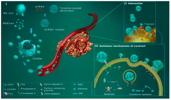 Schematic design of the NN/NKEXO cocktail for tumor targeting and drug delivery. (i) Main components of the cocktail: exosomes derived from NK cells (NKEXOs); exosome camouflaged core–shell nanoparticles (NNs). CD47 and CXCR4 facilitate a more accurate and active delivery of NNs. (ii) Interaction of the nanoparticle cocktail with target cells. Both NKEXOs and NNs are involved in exosome-to-membrane fusion and receptor-ligand interaction. (iii) Mechanisms of cocktail antitumor effect include perforin/granzyme mediated apoptosis, FasL/Fas mediated apoptosis and the effect of released therapeutic miRNA.