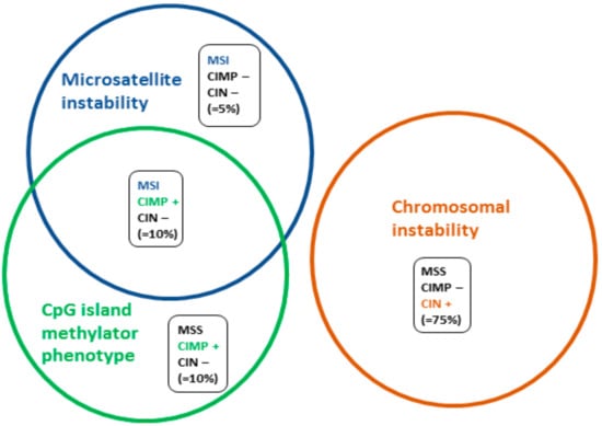Simplified molecular subgroups of colorectal cancers. There are three major mechanisms of colorectal carcinogenesis, 75% of chromosomal instability, 20% of DNA methylation, and 15% of microsatellite instability or deficient DNA mismatch repair []. MSS: microsatellite stability, MSI: microsatellite instability, CIMP: CpG island methylator phenotype, CIN: chromosomal instability.