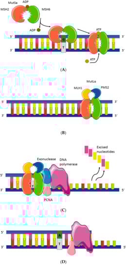 - Acharya, S.; Wilson, T.; Gradia, S.; Kane, M.F.; Guerrette, S.; Marsischky, G.T.; Kolodner, R.; Fishel, R. hMSH2 forms specific mispair-binding complexes with hMSH3 and hMSH6. Proc. Natl. Acad. Sci. USA 1996, 93, 13629–13634. [Google Scholar] [CrossRef] [PubMed]