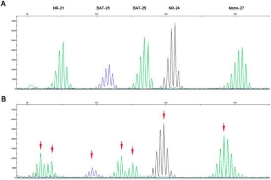 MSS and MSI profiles using the pentaplex panel. (A) MSS profile of the five consensus mononucleotide repeats and (B) MSI profile with 5 unstable mononucleotide repeats. Red arrows indicate microsatellite instability.