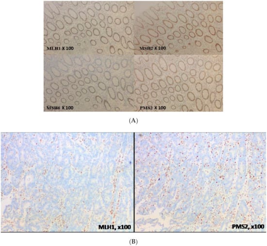 - McCarthy, A.J.; Capo-Chichi, J.M.; Spence, T.; Grenier, S.; Stockley, T.; Kamel-Reid, S.; Serra, S.; Sabatini, P.; Chetty, R. Heterogenous loss of mismatch repair (MMR) protein expression: A challenge for immunohistochemical interpretation and microsatellite instability (MSI) evaluation. J. Pathol. Clin. Res. 2019, 5, 115–129. [Google Scholar] [CrossRef]