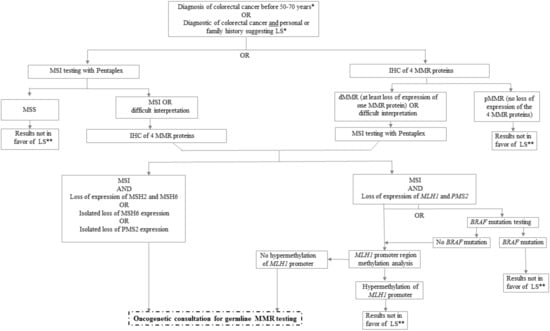 According to the model described by Knudson et al. for tumor suppressor genes such as MMR genes, one allele of the MMR gene has a germline mutation (first hit) and the second allele of the same MMR gene is inactivated at the somatic level (second hit) by various alterations (somatic mutation, genomic rearrangement, promoter hypermethylation, and loss of heterozygosity), which induce deficiency of the MMR system []. International guidelines have defined algorithms to efficiently identify LS patients among patients with sporadic dMMR/MSI tumors (Figure 5) [].