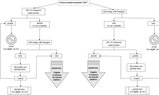 - Cohen, R.; Hain, E.; Buhard, O.; Guilloux, A.; Bardier, A.; Kaci, R.; Bertheau, P.; Renaud, F.; Bibeau, F.; Fléjou, J.F. 537P Assessment of local clinical practice for testing of mismatch repair deficiency in metastatic colorectal cancer: The need for new diagnostic guidelines prior to immunotherapy. Ann. Oncol. 2018, 29, mdy281-083. [Google Scholar] [CrossRef]
