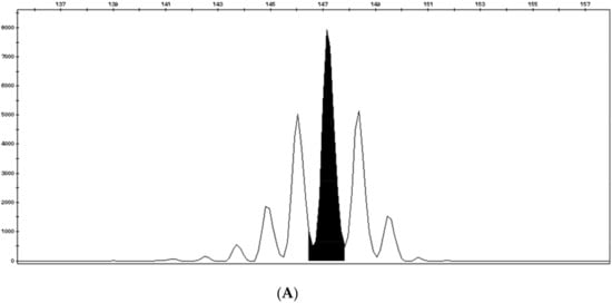 The second panel is the pentaplex panel, which consists of the following five consensus mononucleotide repeats: BAT-25, BAT-26, NR-21 located in the untranslated 5’ region of the SLC7AB gene, NR-24 located in the untranslated 5’ region of the ZNF-2 gene, and NR-27 (MONO-27) located in the untranslated 5’ region of the IAP-1 gene. The quasi-monomorphic nature of these microsatellites facilitates their analysis; they have several repetitions and their size is highly homogeneous in the Caucasian population []. Using the pentaplex panel, a tumor will be called MSI if at least three markers out of five are unstable (Figure 3B). A tumor with no instability, or one unstable marker, is classified MSS (Figure 3A). In very rare cases, where two markers are unstable, a healthy tissue analysis is carried out to confirm or deny instability by comparing healthy and tumor tissue. This panel has become the new standard, in most international recommendations for MSI testing; contrary to the Bethesda panel, it does not require comparison with non-tumor tissue for MSI determination in CRC [].