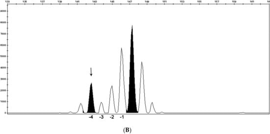 Microsatellite instability testing of HSP110 T17. (A) MSS tumor with T16/T16 phenotype (major peak at 147 bp) and (B) MSI tumor with large deletion of HSP110 T17, patient with a T16/T17 phenotype (peaks at 147 and 148 bps in the polymorphic zone). The major peak selected to determine size of the deletion is the peak at 147 bps and the black arrow corresponds to a deletion of 4 bps.