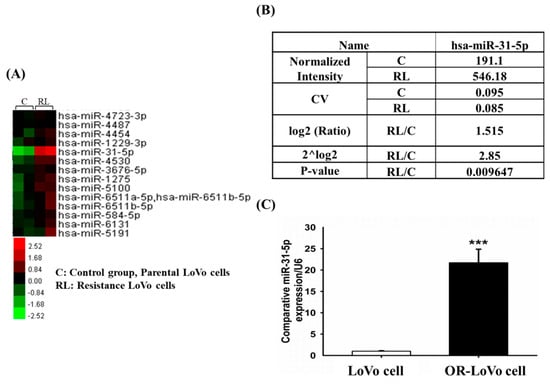 2.2. MicroRNA Expression Differed between LoVo and OR-LoVo Cancer Cells