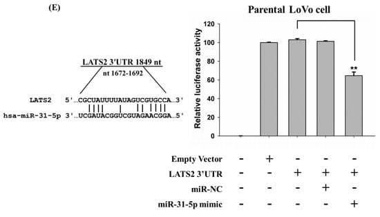 2.4. LATS2 is a Direct Target of miR-31-5p in Colorectal Cancer Cells